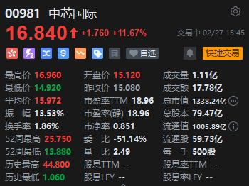 2月27日消息,半导体龙头中芯国际大涨超11%,报16.84港元,成交额17.78亿港元,总市值1338.24亿港元。