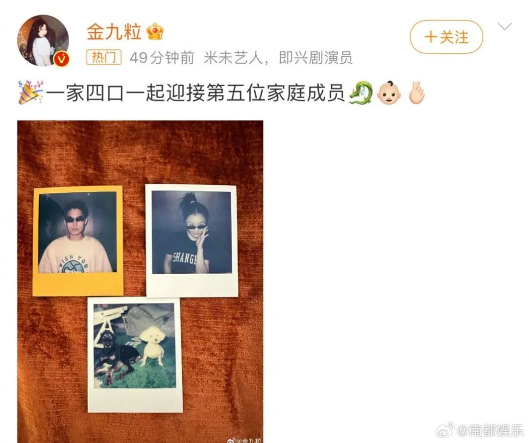 今天,金靖官宣怀孕,发文:“一家四口一起迎接第五位家庭成员”,配图是金靖、男友、狗狗的拍立得。