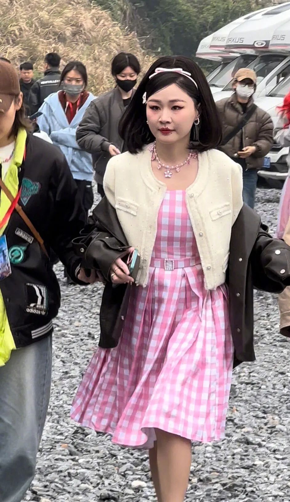 金靖刚录制“萌探”,路透造型cos了粉色芭比和西施↓