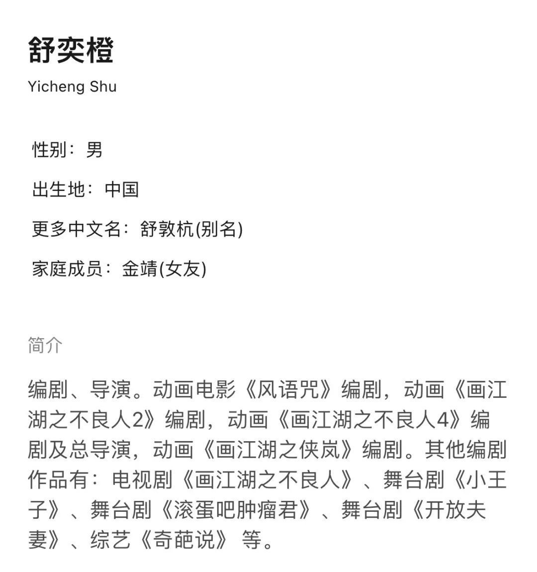 豆瓣个人页上,舒奕橙家庭成员已经写了金靖。他担任过不少动画的编剧、导演。作品有《风语咒》《画江湖之不良人2》《画江湖之不良人4》《画江湖之侠岚》等。