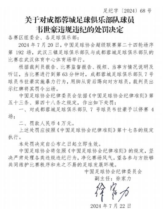 据中国足球协会官方网站消息,7月23日,中国足协发布关于对成都蓉城足球俱乐部队球员韦世豪违规违纪的处罚决定。全文如下:
